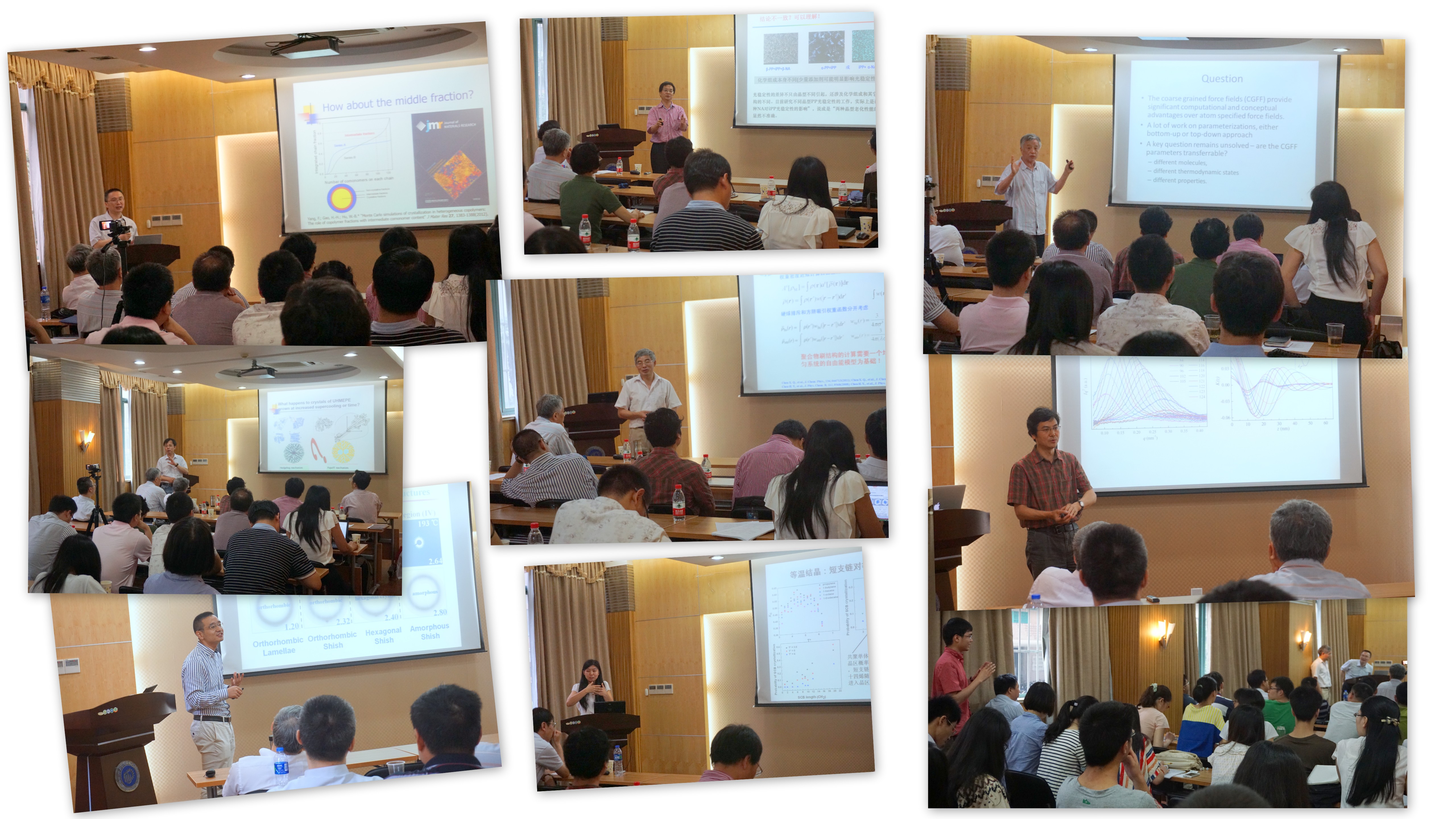 与会专家们分别从聚烯烃结晶机理的实验研究及分子模拟等方面给华理的师生们带来了八场高水平的学术报告。专家们的报告旁征博引,精彩纷呈,对聚烯烃结晶机理及影响因素、先进聚烯烃结晶表征手段、聚烯烃结晶的动态Monte Carlo及分子动力学模拟、粗粒化力场可迁移性等方面做了详尽的介绍,获得来自304永利集团、材料科学与工程学院以及化学与分子工程学院等的百余位师生的阵阵掌声,会场从早到晚始终座无虚席,师生们也积极讨论发言,与专家们共同探讨了聚烯烃结晶行为的分子模拟与实验研究的最新学术理论和技术,以及其对聚烯烃高分子挤出、注塑等生产工艺的重要指导意义。会议得到与会特邀嘉宾、企业专家和华理师生们的高度评价。