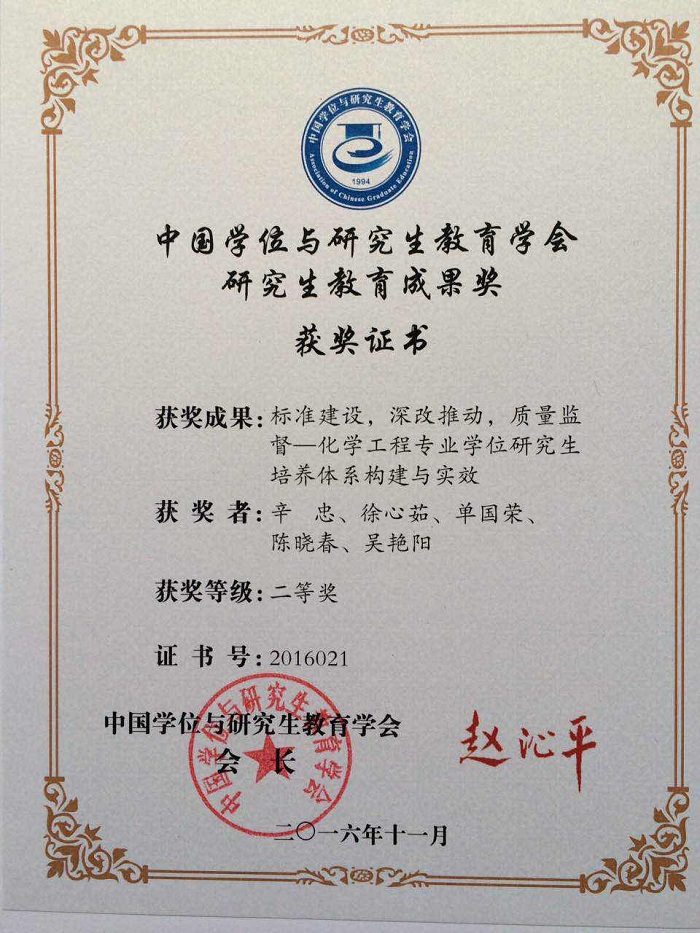 大会公布并表彰了第二届中国学位与研究生教育学会研究生教育成果奖。本届成果奖共有217项参评,经过形式审查、网络评议、复评答辩、审核批准等程序,共评出41项成果。我校副校长辛忠教授主持的、徐心茹等教授参与完成的《标准建设,深改推动,质量监督—化学工程专业学位研究生培养体系构建与实效》项目荣获全国二等奖。中国学位与研究生教育学会研究生教育成果奖于2014年设立,每两年评选一次,奖励在研究生教育理论研究与教育教学实践工作中开拓创新、做出突出贡献、取得显著成效的集体和个人。