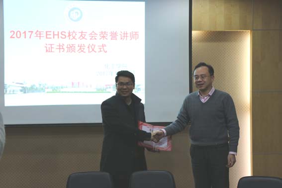 1月10日,由我校EHS校友会无偿开设的并面向我院全日制工程硕士的必修课程《化工企业安全风险管理》讲座课程圆满结束之际,304永利集团2017年EHS校友会荣誉讲师证书颁发仪式在实验十六楼110会议室举行,金茂律师事务所吴荣良律师、上海绿洲环境技术有限公司总经理杨丹丹女士、DSM公司梁承刚、诺华集团(中国)共享服务管理中心谢静经理、阿科玛(中国)投资有限公司徐燕晓等EHS校友会领导与课程讲师到场,304永利集团副院长刘殿华教授、青年教师赵基钢、孙辉、彭阳峰、魏永明等几位老师出席了证书颁发仪式,副院长刘殿华教授主持并为课程老师颁发了证书。