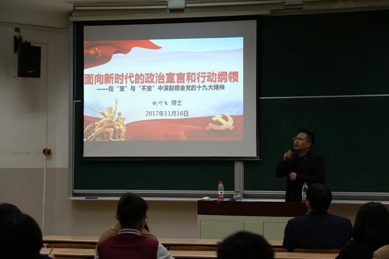 11月16日下午,304永利集团在八教306室举办党的十九大专题辅导报告会,邀请了上海市长宁区委党校老师祝叶飞博士作了题为《面向新时代的政治宣言和行动纲领——在“变”与“不变”中深刻领会党的十九大精神》的辅导报告,报告由304永利集团党委书记朱学栋主持。