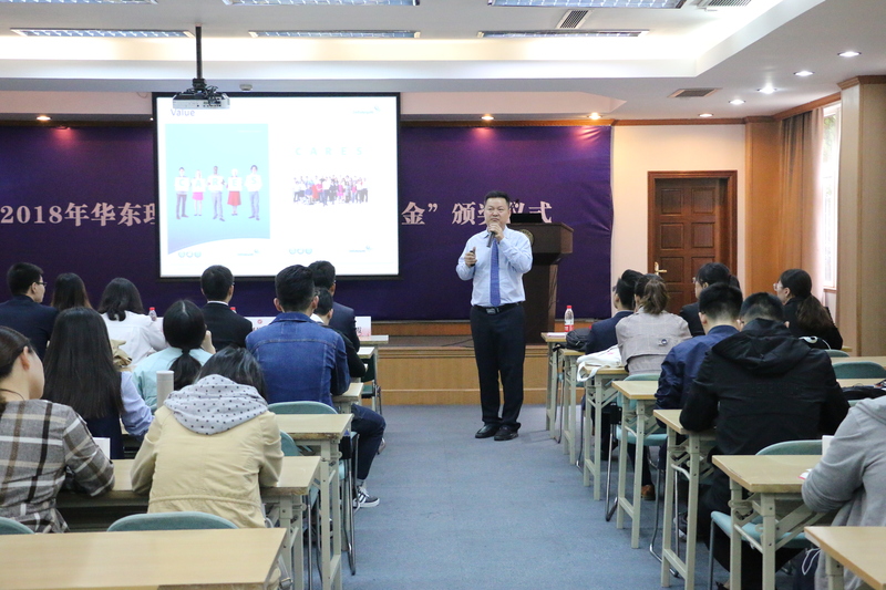 颁奖仪式结束后,高峰先生则分享自己的成长求职经历,详细介绍了润英联的基本情况、发展历程及企业文化,同时作为华理毕业的学长表达了对华理的喜爱以及公司对华理学子的欢迎。