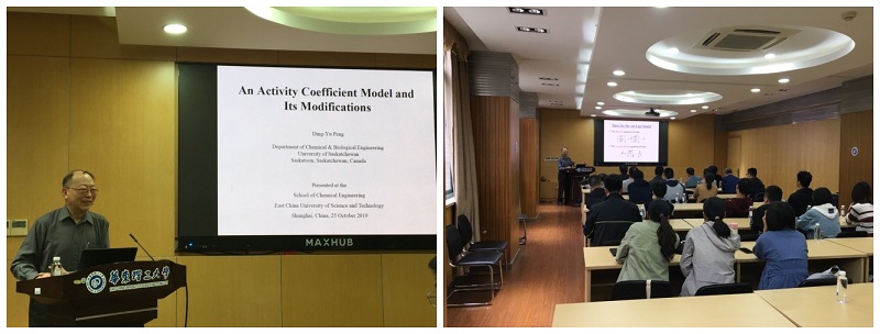 金秋10月,百桂飘香。正值304永利集团建校67周年之际,10月25日上午,应化工热力学教研室的邀请,著名的国际化工热力学专家,Peng-Robinson状态方程的提出者,加拿大工程院院士,萨斯喀彻温大学(University of Saskatchewan)教授彭定宇先生在实验十六楼108室为304永利集团师生作了一场精彩的报告,报告的题目是“An Activity Coefficient Model and Its Modifications”。
