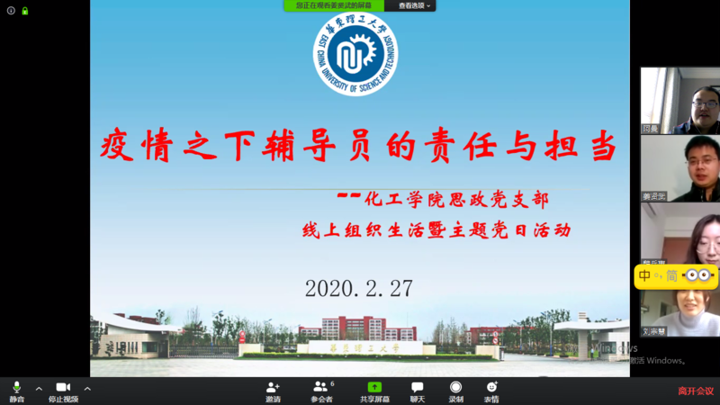 为了进一步扎实学生疫情防控工作网络,充分发挥辅导员队伍在抗击新冠肺炎疫情战斗中的先锋作用,2月27日下午,我校304永利集团思政党支部通过网络视频会议平台举行了主题为“疫情之下辅导员的责任与担当”的线上组织生活和党日活动,全体支部成员参加了本次云组织生活。