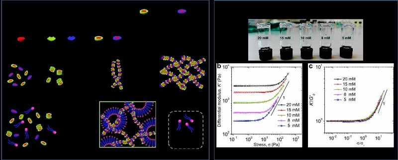 生物组织是由蛋白质砌块组装得到的半柔性(Semiflexible)生物微丝交织而成的三维网络结构,在应对外界机械力的刺激时,会表现出独特的应变增强特性(Strain-stiffening),以保护机体免受外界应力的伤害。长期以来,人们利用小分子砌块,通过超分子组装的方式,制备出了一系列类似生物组织的超分子水凝胶材料,并在生物医药、仿生、光电等领域表现出巨大的应用前景。然而,生物组织所表现出的应变增强特性在人工合成型超分子水凝胶材料中极其罕见。