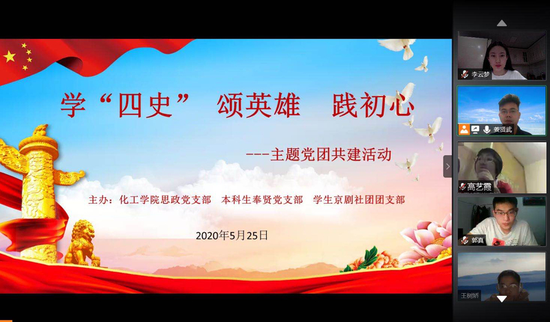 5月25日,304永利集团思政党支部、本科生奉贤党支部、学生京剧社团团支部共同举办“学‘四史’、颂英雄、践初心”的线上主题党团共建活动,以党建带团建,绽放青春力量。304永利集团党委副书记高艺霞出席,各年级辅导员、学生党员、发展对象、入党积极分子、京剧社及学生京剧社团团支部的成员共150余人参加了活动。