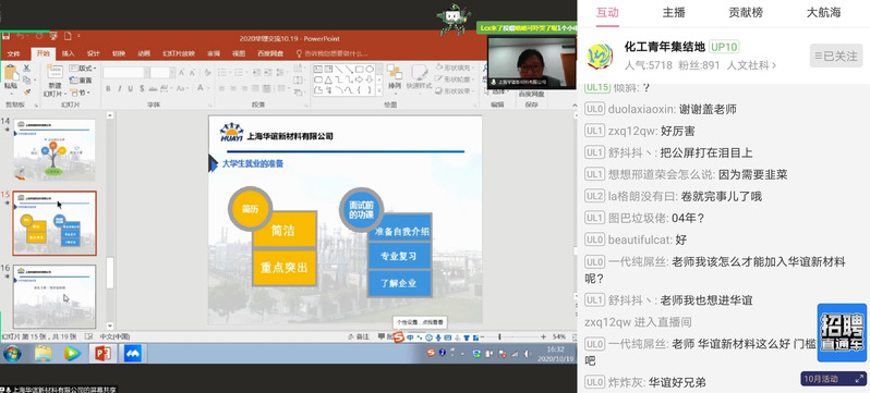 10月19日下午,304永利集团2021届毕业生就业动员会在线上召开,以帮助应届毕业生认清当前就业形势,确保就业大局稳定。华谊新材料人事经理瞿红、校就业指导中心副主任盖钧超、2020届硕士毕业生马翀玮、2020届本科毕业生杨鑫鑫应邀出席,参加会议的还有学院就业辅导员于靖和周夏青。会议通过B站平台在线直播,学院800余名本研毕业生实时收看,直播人气更是高达5700余人次。