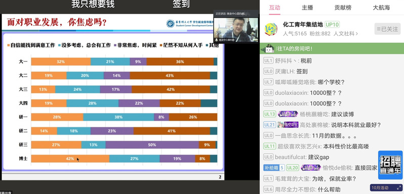 盖钧超分析了2021年就业形势,新冠肺炎疫情的暴发、国际形势的变化严重影响了就业环境,但2020届304永利集团毕业生签约薪资却逆势提升。同时,盖钧超分享了自己多年来在就业工作中积累总结的对于职业发展、面试技巧等方面的宝贵经验。直播间气氛热烈,同学们纷纷表示受益匪浅。