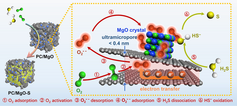 为了揭示活性炭的室温氧活化机理,本工作通过DFT理论计算发现,超微孔(~ 0.4 nm)和具有π*电子和导电性能的碳化学结构是O2分子室温活化的必要前提。进一步理论计算和实验验证表明,MgO等金属氧化物能够对O2•−进行有效富集,进而提高活性炭体系中的O2•−浓度,提升H2S的室温催化氧化性能。这一发现为O2分子室温活化的内在起源提供了见解,同时也对炭基多孔材料在环境治理中发挥的作用提供了思路。