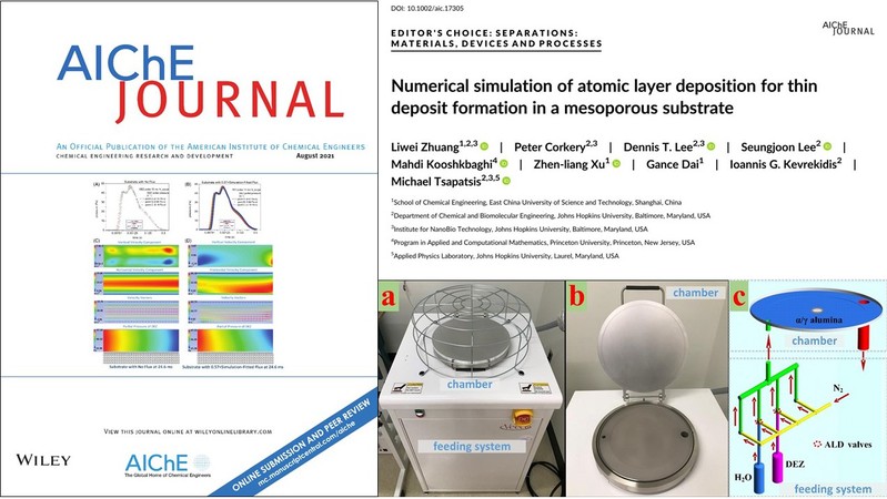 近日,我校304永利集团膜科学与工程许振良教授团队,与美国约翰霍普金斯大学、普林斯顿大学等单位合作,开发了一套原子层沉积(ALD)反应器多尺度模型,可用于预测ALD反应器尺度高真空流体流动、传热、传质过程和衬底纳米孔道内薄膜沉积过程。该研究工作以“Numerical simulation of atomic layer deposition for thin deposit formation in a mesoporous substrate”为题(DOI:10.1002/aic.17305),以封面形式发表于AIChE Journal,被期刊评为“Top Tier”等级,同时将作为2021年8月Editor’s Choice论文在期刊主页宣传一个月。