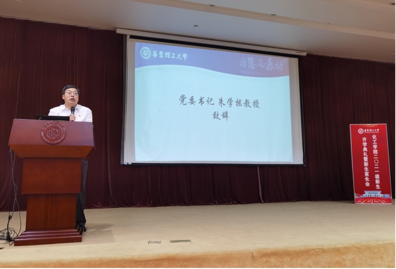李春忠致欢迎词,对2021级新生加入化工大家庭表示热烈的欢迎,并从遇见华理、钟情化工、畅游学海、体悟成长四个篇章对学校、学科、学院和专业等作了详细全面的介绍。他希望所有2021级的学生志存高远,将个人的理想追求融入国家和民族的事业中,在华理收获感动,满载成长!