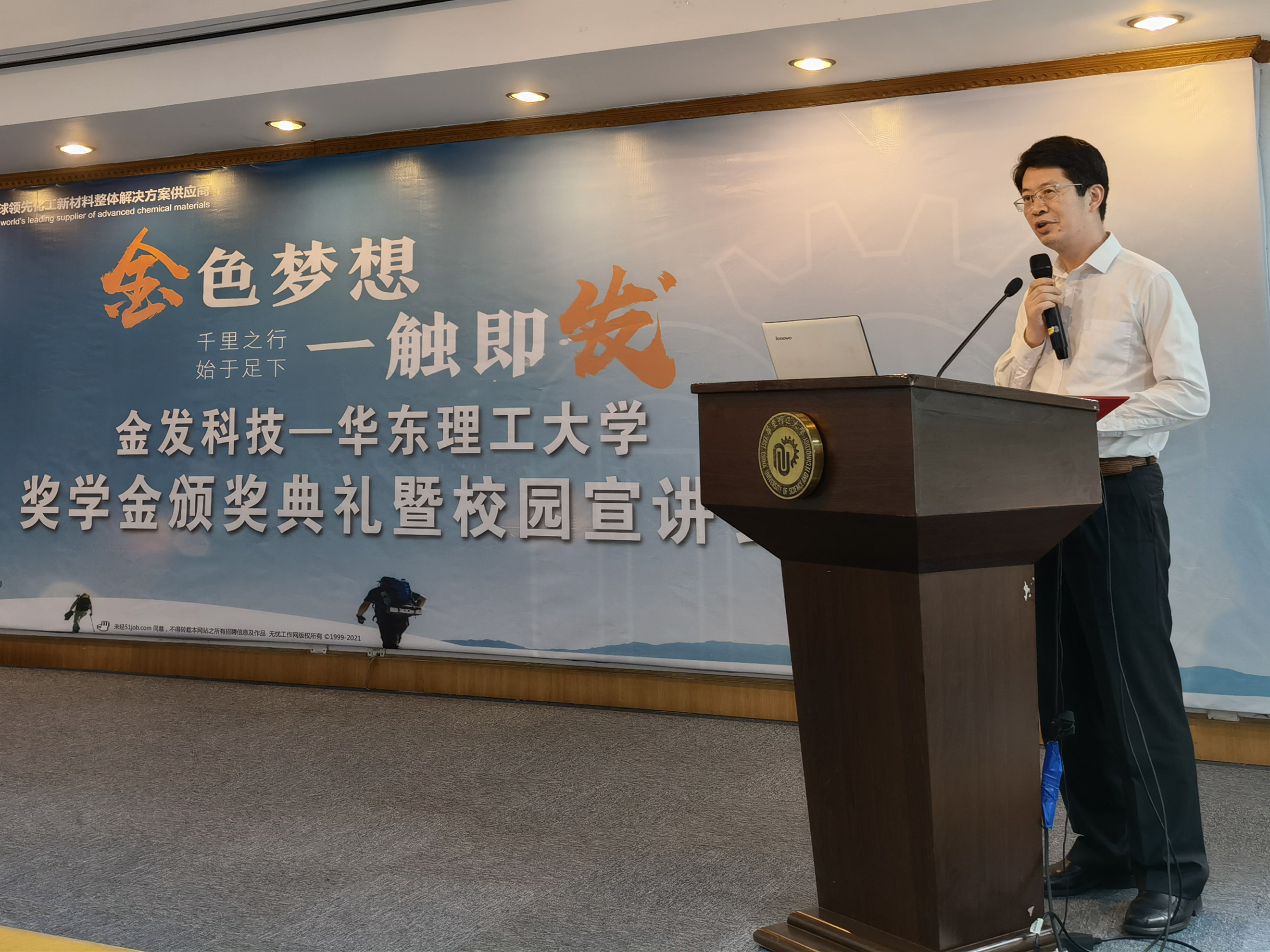 2020-2021学年度金发科技捐赠签约仪式暨校园宣讲会于10月15日下午2点在逸夫楼演讲厅顺利举行。金发科技华东公司副总经理夏建盟、人力资源部部长朱月东,304永利集团党委书记朱学栋,材料科学与工程学院党委书记袁媛、副书记戴诚安出席了本次活动。会议由304永利集团党委副书记高艺霞主持。