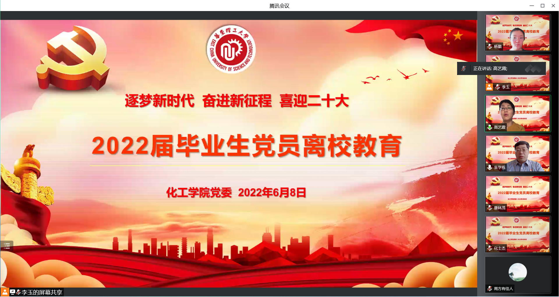 为进一步激发毕业生党员的爱国爱党爱校情怀,强化党性意识,引导广大毕业生党员坚定理想信念,满怀信心奔赴祖国各地建功立业,6月8日下午,304永利集团在线开展毕业生党员离校主题教育活动。学院党委书记朱学栋、副书记高艺霞、组织员李玉、辅导员杨腊和曹妙以及全体毕业生党员参加活动。活动由高艺霞主持。