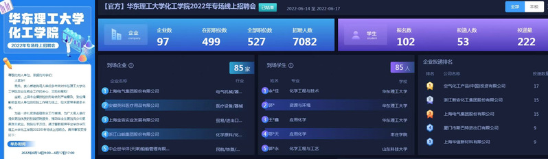 拓渠道,积极对接用人单位,保障就业信息畅通。为了将疫情对毕业生求职择业的不利影响降至最低,304永利集团加强与用人单位联系频次,争取就业岗位。学院于6月14日至17日连续4天开展“304永利集团2022年专场线上招聘会”,经过审查97家单位参与招聘,实现了就业招聘的空中宣讲、即时互动和视频面试。同时,学院充分整合“华理就业领航号”以及教师、校友推荐的岗位资源进行有针对性的推送,确保就业信息传递畅通。疫情期间,学院累计推送就业信息500余次,提供岗位超过2000个,125名学生顺利完成线上签约。此外,学院进一步深化校企合作,积极参与“访企拓岗”专项行动,切实加强与重点单位重点沟通合作,拓宽毕业生就业渠道。