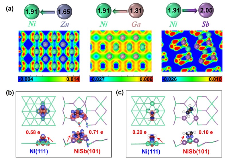 为此,该研究团队针对非贵金属Ni基催化剂,通过理论计算研究发现当客体金属电负性逐渐增加时,Ni位点的电子密度逐渐降低,其对应的加氢性能显著提升,预示着高电负性客体金属对Ni位点的修饰更为有利。与d区的客体金属Zn相比,p区的客体金属Ga和Sb与Ni位点存在显著的d-p杂化现象。有趣的是,采用高电负性的p区金属Sb隔离Ni位点时,电子转移的方向发生了逆转,即Ni位点的电子转移至Sb位点。基于此,提出了通过具有富电子Sb位点孤立缺电子Ni位点的结构特征设计构筑Ni1Sb2三原子活性位点的新策略。理论计算结果表明Ni1Sb2三原子活性位点可以兼顾亲电性乙炔的σ-构型吸附和亲核性乙烯的π-构型吸附,促进乙炔选择性加氢生成目标产物乙烯。