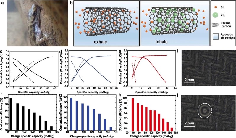 水系超级电容器由于其较高的功率密度以及优异的循环寿命,受到了广泛的关注。然而,基于阴阳离子吸/脱附的超级电容器,能量密度远低于锂离子电池等其他电化学储能器件,这严重限制了其大规模应用。氯具有成本低廉、能量密度高以及氧化还原反应速率快的优点,非常适合于电化学储能器件应用。但是,气态氯的储存难题限制了其发展。在该研究中,受到一种水生蜥蜴的启发,研究人员采用多孔碳来储存释放充放电过程中产生的氯气。