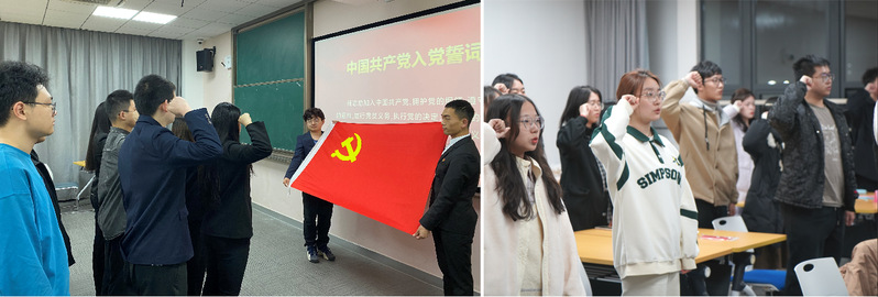 宣誓仪式在庄严雄壮的《国际歌》中拉开序幕,曹妙宣读了奉贤校区新发展的党员名单,并带领全体党员面向党旗庄严宣誓。声声誓言,铮铮有力,字字千钧,表达了每一名新党员对党的赤诚忠心和为共产主义奋斗终身的坚定决心,也鼓舞着现场的入党积极分子。随后,学生党支部支委和党小组组长为新发展的党员佩戴党员徽章,并嘱托他们牢记党员身份,争做堪当民族复兴重任的时代新人。