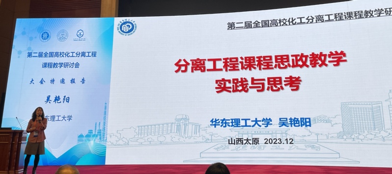 我院漆志文、吴艳阳、成洪业三位教师参会。吴艳阳做了“分离工程课程思政教学实践与思考”的大会特邀报告,分享了我院分离工程在课程思政育人方面的探索与实践成果。“分离工程”课程通过设计“课程思政+项目式教学+信息技术”全面融合的特色教学内容,按照专业认同、使命担当和科魂匠心三个层面逐级深入展开,关注学生个性化培养与过程性评价,注重教师在教学全过程的言传身教,落实立德树人根本任务。