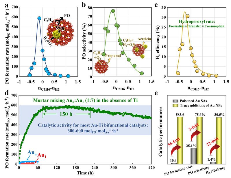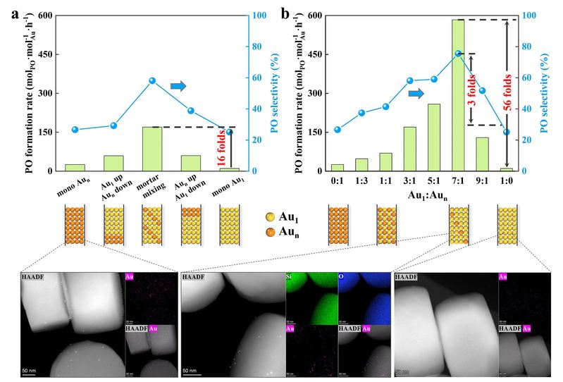 图片说明:Au SACs与Au NPs间的接力催化大幅提升丙烯环氧化反应性能