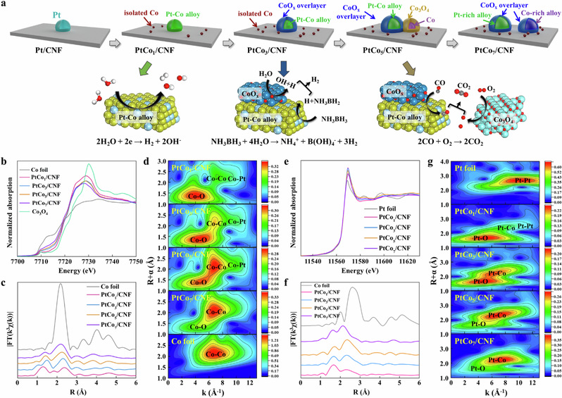针对Pt-Co双金属催化剂,研究团队结合多重显微和光谱表征、多尺度模拟、同位素标记和稳态同位素瞬态动力学分析(SSITKA)等技术,揭示了载体和吸附质引起的颗粒结构变化。发现在强Pt-C键(金属-载体界面)和Co-O键(金属-吸附质界面)的驱动下,随着Co在Pt催化剂中的掺杂,首先形成富含Pt的合金,并伴有孤立的Co物种;进一步,Co偏析到Pt催化剂表面,形成外延的CoOx氧化层和邻近的Co3O4簇;最终颗粒结构坍塌为无定形的合金。