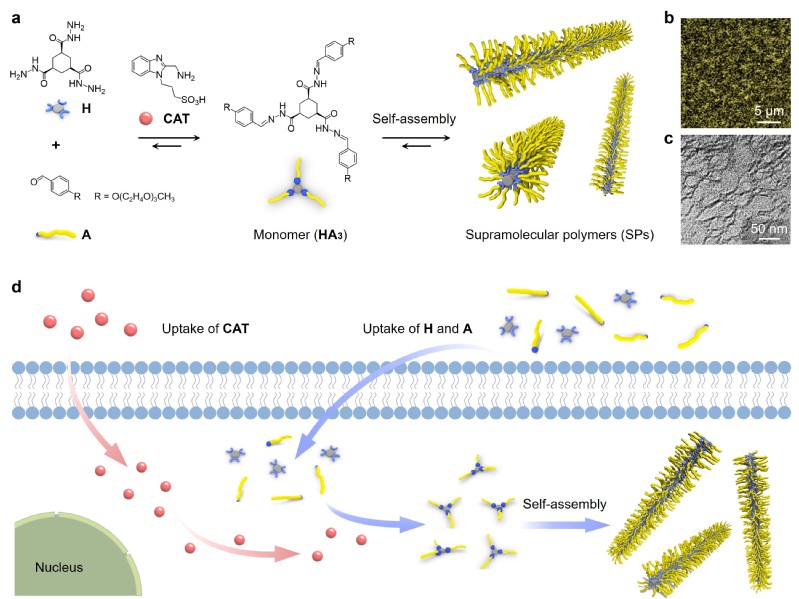 活细胞依赖生物大分子自组装形成的超分子聚合物执行关键生理功能,受生命系统启发,一些列合成型超分子聚合物已经被设计并合成出来。将人工合成超分子聚合物与生命系统相融合,将有望为生物功能干预和疾病治疗开辟新路径。然而,现有技术多依赖酶触发肽类分子自组装,存在功能单一、稳定性差、可控性低等问题;传统共价聚合物虽能在细胞内合成,却因缺乏动态响应性难以满足生物兼容需求。如何在复杂胞内环境中实现完全非生物超分子聚合物的可控合成仍是一大挑战。